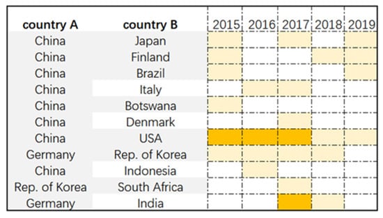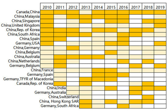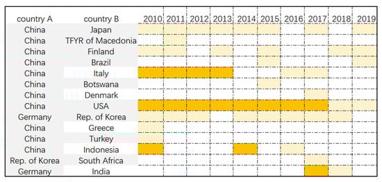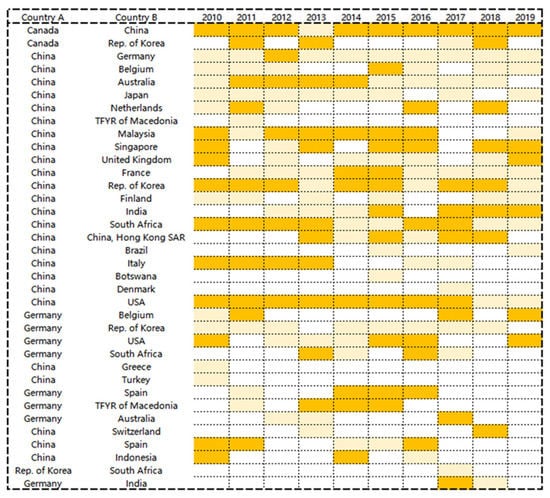 We sorted the top ten potential link country pairs for 2010 to 2019 and obtain 36 nonrepetitive country pairs because some potential trade relations have repeated over the decade. As shown in Figure 4 below, pairs of countries are listed as potential trade partners. The area shaded in light yellow indicates that there are no potential trade relationships among the top ten PA values. The orange-shaded section indicates that the two countries engaged in nickel ore trade in the same year.