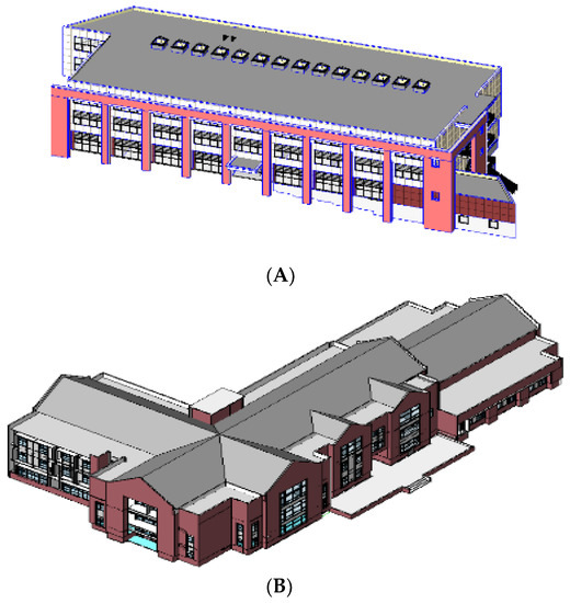 Building I (Figure 3A) is a three-story building of about 48,911 ft2 (4544 m²) gross area that was completed in 2003 with an average annual electric (coal) and heating (natural gas) demand of 1563 GJ and 2965 GJ, respectively. It is oriented on a north-south axis, while two major facades of the building face in the east and west directions. Due to the implementation of large glazing facades, most parts of the building are lit by daylight throughout the year. Furthermore, recycled content, manufacturing proximity, low toxicity, low maintenance requirements and recyclability were considered when choosing the materials used in the building construction. Building I received an LEED Gold certification from the USGBC.