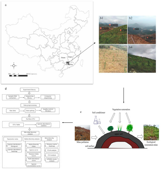 Geographical location of the study region (a) and the landscape of sampling sites, of which (b) b1 was the study sample plot, b2 was the landscape view of UD and UR, and b3 (ER1) and b4 (ER2) were the landscape view of the ecological restoration area. (c) was the schematic diagram of the mine’s ecological restoration process. (d) was the 16S rRNA gene sequencing and data analysis process.