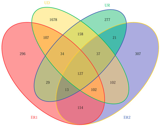 After filtering the low-quality sequences and chimeras, 305,165 high-quality sequences were retained from the integrated data set. A total of 5001 OTUs were detected according to 97% similarities. Results showed that the specific OTU numbers of ER1, ER2, UD, and UR were 296, 307, 1678, and 277, respectively, UD > ER2 > ER1 > UR, indicating that the soil microbial groups of virgin forest were the most abundant, while those of the unrestored soil after destruction were the least. The similarity of ER1 and ER2 microbial groups was high, indicating that there was no significant difference in microbial diversity in the restoration soil (Figure 2).