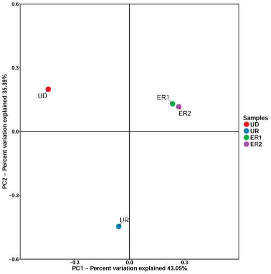 The principal coordinate analysis can be used to classify multiple samples to further display the diversity differences among samples. The closer the samples are on the coordinate map, the greater the similarity. The results of PCOA analysis showed that the principal component interpretation of PC1 and PC2 in soil samples were 43.05% and 35.39%, respectively (Figure 4). The coordinate distances of ER1 and ER2 were very similar, indicating that the similarity between the soil samples after restoration was obvious, and the diversity of microbial species among the groups was not significant. However, UD and UR coordinates were dispersed, indicating significant differences in microbial species composition and distribution among the groups, which might be due to heavy metal pollution that destroyed microbial diversity.