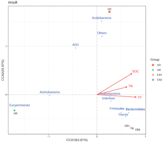 The correlation between bacterial communities’ structure and soil physicochemical properties was analyzed based on the dominant bacteria species at phylum level (Figure 5). The red arrows represent different environmental factors. The longer the ray of the environmental factor, the greater the influence of the factor. The angle between different physicochemical properties represents the correlation between the two factors, and the acute angle represents the positive correlation, while the obtuse angle represents the negative correlation. The results showed that the eigenvalues of the first and second axes are 63.81% and 35.97% respectively. The first two axes account for 99.78% of the total variation in the bacterial community. The CCA diagram clearly shows that SOC, TN, and TP were concentrated in the same direction. The environmental factor with the longest ray was SOC, indicating that SOC was the main factor leading to the difference of bacterial dominant groups, followed by TP. Proteobacteria, Firmicutes, and Bacteroidetes were highly correlated with SOC, TN, and TP. In addition, UD, ER1, and ER2 were positively correlated with environmental factors in the same direction, but negatively correlated with UR.