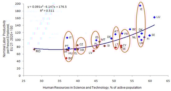 Figure 1 shows that there is a correlation between the human resources share in science and technology and the nominal labor productivity per person employed. Human resources in science and technology as an indicator of a knowledge-based economy are one of the determinants of the EU countries’ labor productivity. Furthermore, the variation of this indicator statistically explains 51% of the variation of nominal labor productivity per person employed across the EU countries.