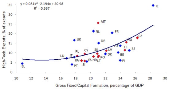 Gross fixed capital formation and high-tech exports, 2018. Source: Eurostat.