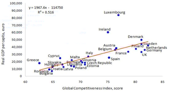 Figure 3 depicts the relationship between the Global Competitiveness Index and GDP per capita for the EU countries.