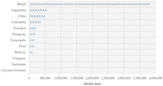 In Figure 1, according to data from the USDA (United States Department of Agriculture), Brazil was the leading producer of pork in South America with 3,824,682 metric tons in 2017. Ecuador was the fifth-greatest producer with 218,110 metric tons [15].
