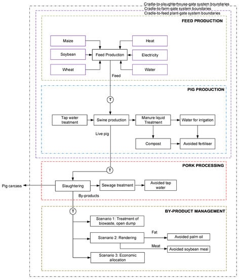 Since China is the country where approximately 50% of pigs are raised globally [18], this production is attributed to the primary source of GHGs in the food supply chain in this country, since it requires several resources such as the animals themselves, facilities for their accommodation, feed, agriculture, machinery, slaughter, solid and liquid waste management, transportation, among others [19]. Pig production is associated with environmental interventions mostly linked to feed production and manure generation [2].