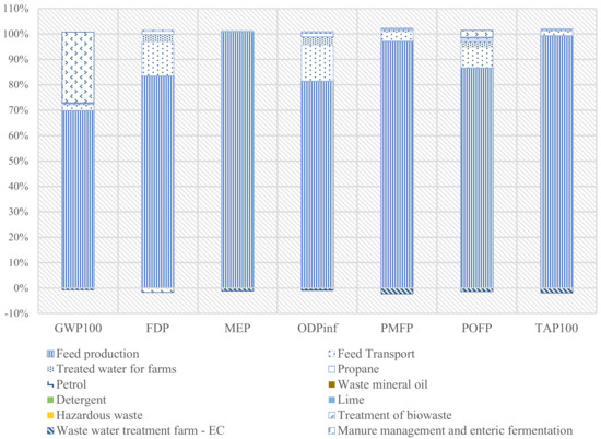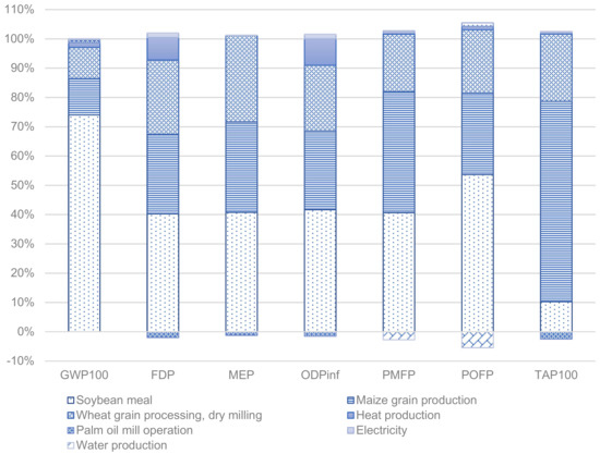 The potential environmental impacts of 1 kg of feed are presented in Table 10 for the impact categories evaluated. A contribution analysis is illustrated in Figure 3.