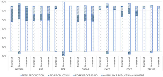 Depletion of the Ozone Layer—In this category, the greatest contributors were feed and pork processing for the two scenarios. In the first and third scenarios, feed production had a contribution of 66%, while in the second, 67%. In scenario 1, pork processing had a contribution of 19.27%, and in scenario 2, 18.85%, with a contribution of −1.50% from the handling of by-products due to the displacement of products.