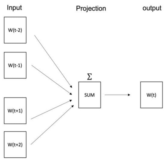 There are two models for implementing Word2Vec: the continuous bag-of-words model (CBOW) and the skip-gram model. Even though the two models are both widely used in conducting word2vec, these models can be optimized depending on the goals and direction of the research. The skip-gram model computes the possibility of the target words in several contexts from a word. The model has multinomial distributions for the outputs. It can be effective when research is trying to figure out fewer frequency words. On the other hand, CBOW is more suitable for studies that concentrate on high-frequency terms. In this study, since the authors focused on important keywords that can explain accidents on construction sites and frequently appearing words, the authors implemented Word2Vec with the CBOW model. The CBOW model predicts words by considering context, which means the target word is predicted from surrounding words (W(t−n), W(t−n+1)...W(t+n)) of the target word, and thus, it has one output vector. Input consists of one-hot encoded input context words. Figure 1 shows an overview of the CBOW model.