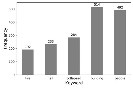 The five keywords were “fire”, “fell”, “collapsed”, “building”, and “people”. The selection criteria considered the types of accidents on construction sites and keywords representing building fire. In many studies, three major elements of building fire are defined as a “fire”, “building”, and “people” [50]. In addition, “fell” and “collapsed” are the most frequent types of accidents on construction sites [3]. The frequency of each keyword is shown in Figure 2.