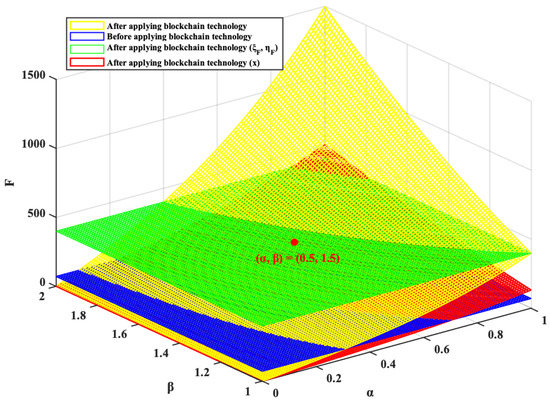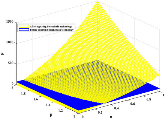 Comparing Equations (27) and (44), we can find that the impact of blockchain on F is reflected in the price, cost, and output efficiency. Driven by the blockchain, the government only needs to share a small proportion of the cost to obtain better emission reduction effects than before, which reduces the government’s economic burden.