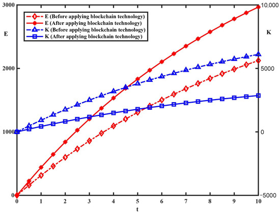 From Equations (26) and (43), we can find that the emission reduction efforts of ECEs are related to abatement cost , emission reduction efficiency , and price x. Assume that and after the introduction of blockchain technology. , , . The results are shown in Figure 2.