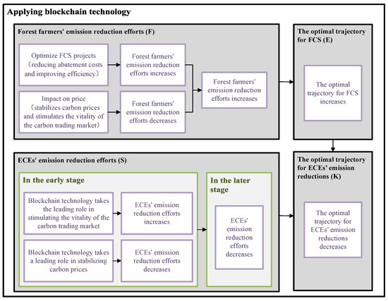 (1) The emission reduction efforts of ECEs are affected mainly by FCS prices, abatement costs, and government subsidies. ECEs choose emission reduction methods with the goal of economic maximization. (1) At the initial stage of the utilization of blockchain technology, if blockchain technology takes stabilizing carbon prices as the leading role, the willingness of ECEs to purchase FCS will increase and the willingness of technology to reduce emissions will decrease. The emission reduction efforts of ECEs will be lower than the level before applying blockchain technology. If blockchain technology takes the leading role in stimulating the carbon trading market, the price of carbon trading is relatively high, and ECEs will tend to achieve carbon quota requirements through their technology to reduce emissions. The emission reduction efforts of ECEs will be higher than the level before applying blockchain technology. (2) In the later stage of the utilization of blockchain technology, the incentive and stabilizing effects of blockchain technology on carbon prices tend to balance, and the emission reduction efforts of ECEs are lower than the efforts before applying blockchain technology.