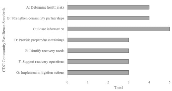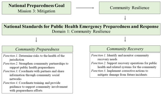 The National Preparedness Goal (NPG) is to create “a secure and resilient nation with the capabilities required across the whole community to prevent, protect against, mitigate, respond to, and recover from the threats and hazards that pose the greatest risk” []. The NPG was conceptualized as five interconnected missions to: (1) prevent terrorism; (2) protect against hazards; (3) mitigate loss of life and property; (4) respond quickly to human needs after a disaster; and (5) recover in a timely and productive manner []. Mitigation included hazard identification, risk assessment, vulnerability reduction, public warning systems, and community resilience (Figure 1). The U.S. Centers for Disease Control and Prevention (CDC) created national standards for the public health components of the NPG; these standards were designed to improve public health emergency preparedness and response capabilities at both the state and local levels []. The national standards consisted of six domains, including incident and information management, countermeasures and mitigation, surge management, biosurveillance, and community resilience []. The CDC standards divided community resilience into two tiers: (1) community preparedness; and (2) community recovery (Figure 1).