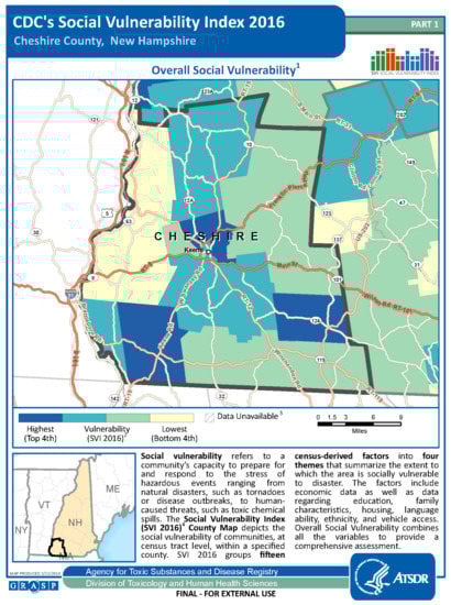 - NH Environmental Public Health Tracking Program. Social Vulnerability Index: An Emergency Response Tool; NH Department of Health and Human Services: Concord, NH, USA, 2018. Available online: https://www.nh.gov/epht/highlights/documents/social-vulnerability-index.pdf (accessed on 16 July 2020).