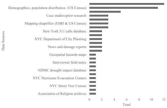 In the 24 articles we fully reviewed, data used to measure resilience were collected using qualitative and quantitative methods in a variety of formats, and from a range of publicly available national, county, and municipal sources (see Figure 4). The most commonly used data sources were project participants and online U.S. census data. Half of the 24 projects used participant surveys and interviews to gather data on population demographics and community resilience indicators. Eleven studies accessed online U.S. census data sources for demographics and population distribution. Three projects accessed county-level U.S. census data and shapefiles for creating maps.