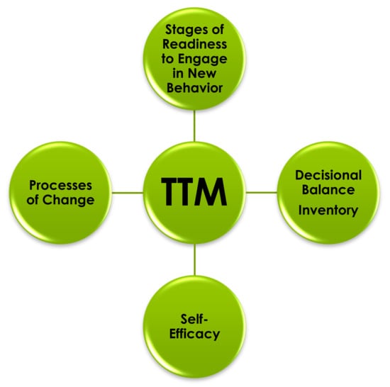 The TTM is an evidence-based psychological approach to understanding and facilitating behavior change []. The TTM has four major constructs: (a) stages of readiness to engage in a new behavior; (b) decisional balance inventory; (c) self-efficacy; and (d) processes of change (Figure 5). The stages of readiness to engage in a new behavior construct is based on the theory that there are five recognizable stages associated with any given behavior change.