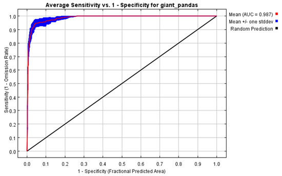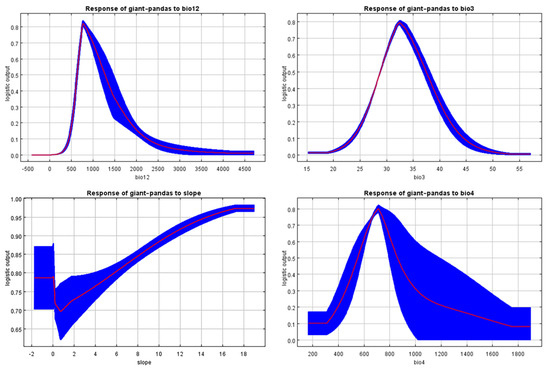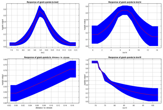 - Managers of relevant departments of the entire MMS area can refer to the environmental contribution rate, and response curve at the MMS extent to take protective measures. For instance, they can monitor the dynamic changes from the factors of ‘changes in daily average temperature’ and ‘precipitation in the driest month’ to ensure that the giant pandas’ habitat has the correct living conditions. The monitoring and control of these environmental variables can more effectively improve the protection capability within the scope of the Min Mountain System. In addition, monitoring points can be set up in areas that are within the pandas’ suitable distance to a water source to improve wild panda investigation and monitoring efficiency.