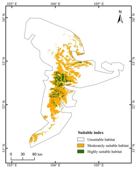 - The local managers of each protected area or county in the MMS should pay attention to the management and restriction of human activities on a small scale. Even though the setting scale of this study is too big to identify the influence of human interference, it can be seen from other literature combined with the model result that human interference has actual impacts on the habitat of giant pandas. For example, the effect of increased grazing needs to be taken seriously by local managers to alleviate the compression of the giant pandas’ natural habitat.