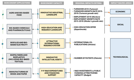 Figure 1. Flow chart to measure the innovation potential of bio-based applications. The data used in MCDA derive from the mapping of bioeconomy capacity (inventories) described in eight criteria organized in three macro-impact areas (economic, social and technological). Regional impact criteria are shown in the full name and abbreviated name (in parentheses).