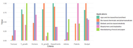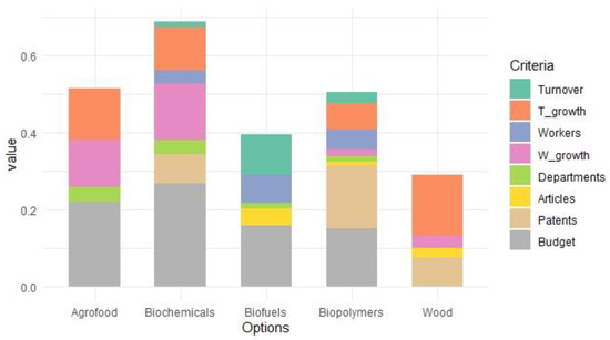 The total scores for the five identified bio-based applications make it possible to rank options from the best to the worst-performing and identify innovation potential concerning the three macro-impact areas (social, economic, technological). With an overall score of 0.6872006, the Biochemicals application ranks first by regional impact, followed by Agrofood, Biopolymers and Biofuels, with a score of 0.5141269, 0.5029931 and 0.3948341, respectively. The manufacturing of wood and paper sector closes the ranking with a total score of 0.2901114, more than halved compared to the top-ranked application. The highest positioning of biochemical in the ranking of innovation potential applications is due to the R&D investments (Budget) criterion, accounting for 39% of the overall score, as shown in Figure 5. Further relevant parameters are the employment growth rate (W_growth) and the turnover growth rate (T_growth), accounting for 21% and 16%. On the other hand, the abundance of international publications (Articles) criterion affecting the innovation potential can be considered marginal.