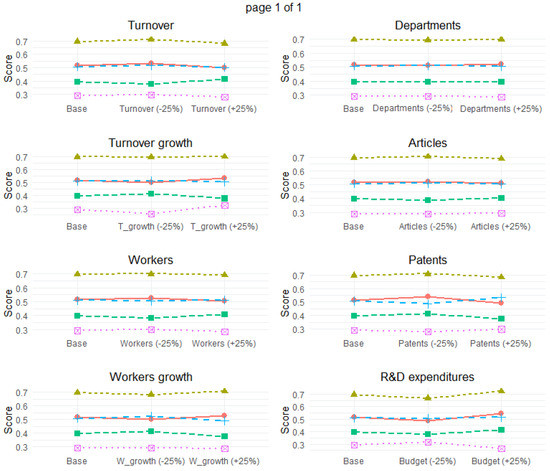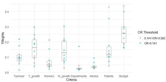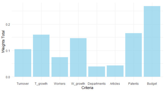 The results of the weights’ attribution obtained from the individual priorities’ arithmetic average are shown in Figure 4. The highest weight was assigned to R&D investments (Budget = 0.26814075), followed by the protection of intellectual property (Patents = 0.16562722), growth in turnover (T_growth = 0.15936269) and employment (W_growth = 0.14592823). The lowest weight was assigned to the high-education offer (Departments = 0.03920736) and the number of international co-publications (Articles = 0.04292915). The weights assigned to turnover (Turnover = 0.15936269) and employees (Workers = 0.14592823) cover intermediate values.