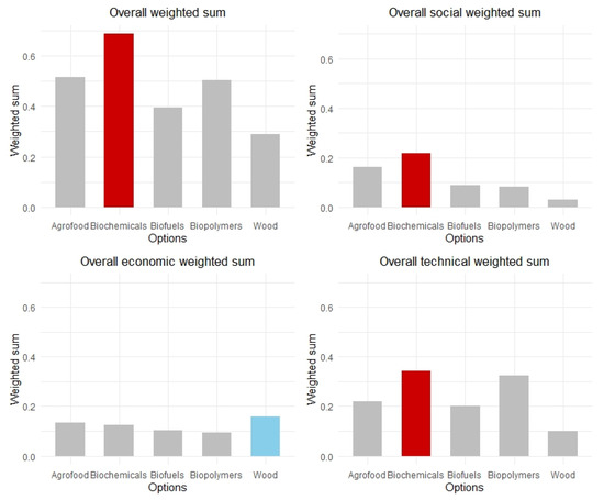 The partial score for each impact macro-category (economy, social, technological), shown in Figure 6, proves the dominant positioning of Biochemicals application, in the first place, except for the economy category, for which Wood stands out. Concerning the social macro-category, the overall ranking is preserved except for the Biofuels application, which ranks third after Agrofood. Finally, the technological impact is driven by the Biochemicals application, but Biopolymers closely follows, with a similar score.