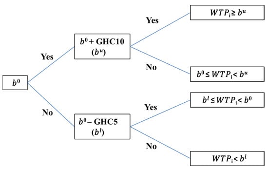 Contingent valuation questions were asked in the third part of the questionnaire using the double-bounded dichotomous choice (DBDC) and open-ended techniques. The DBDC method implies that two different monetary payments are subsequently suggested to survey respondents. The second amount proposed to respondents is contingent on their response to the first proposed monetary payment [42,43,44]. The DBDC technique was adopted for its several advantages. This elicitation method is robust to poorly-designed bids [45,46] and is incentive-compatible [47]. It is also efficient [45] and robust to strategic and cognitive biases [48]. The open-ended question asked directly for the maximum WTP after the first two questions of yes/no type. Both elicitation approaches were used to increase construct validity of the WTP estimates [43].