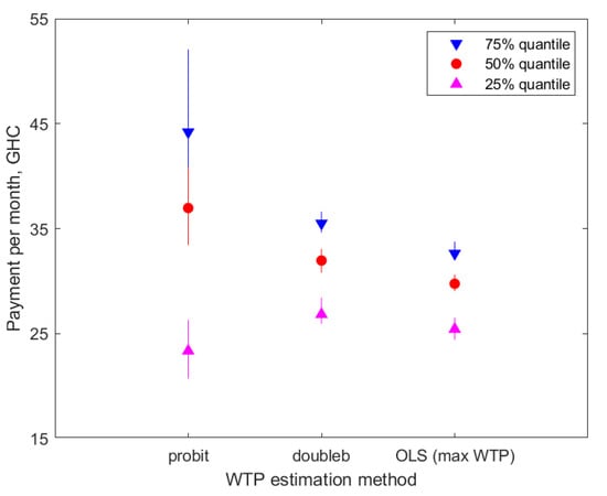 In Table 6, the mean WTP in the full sample is GHC 29.79. This constituted an estimated 9% of the rural households’ discretionary income. This proportion of income to electricity expenditure was consistent with previous contingent valuation results [23,68].