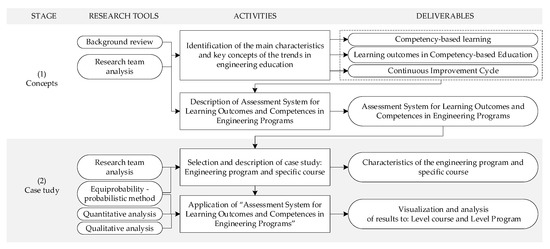 In the first stage, a literature review was carried out to identify the characteristics and key concepts of student learning outcomes and competencies in engineering programs. In order to identify these characteristics, it was necessary to recognise some keywords, which were selected based on relevance. The search was carried out in the Web of Science and Scopus libraries, with the incorporation of manuals and technical reports from recognised entities in the area and university accreditation organizations. Documents were selected from the year 1998 to the present. The following search topics were considered: (a) Competency-based education, (b) learning outcomes in CBE, and (c) continuous improvement cycle. Later, based on the general bibliographic support and a preliminary proposed method by the research team in [18], an “Assessment System for Learning Outcomes and Competencies in Engineering Programs” was described.