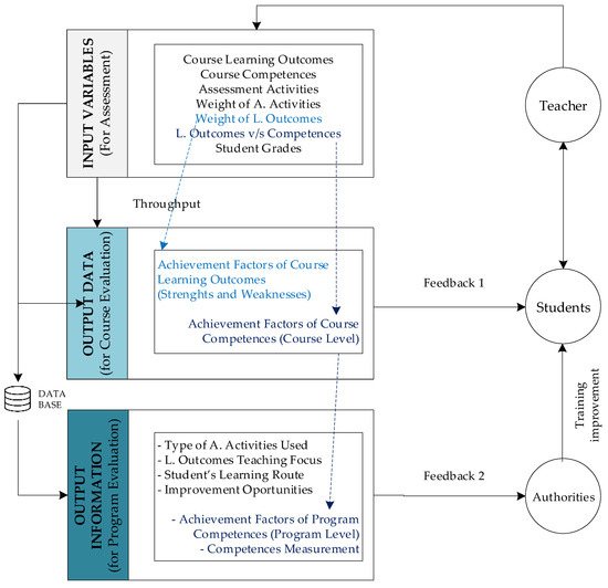 This system methodology allows assessment, evaluation, and improvement at course and program levels. The program level assessment is defined by the average of all the courses involved in the evaluation strategy or, if applicable, by previously defined weightings (for example, by SCT). For these purposes, it recommends a unified database in which teachers can enter, save, and modify the parameters they use in their assessment process.