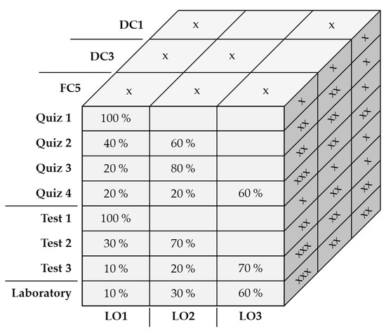 Figure 4 shows the triad: competencies, learning outcomes, and assessment activities. It is possible to see the allocation of the weights to the learning outcomes for each activity, along with the correspondence between the learning outcomes and the competencies (as indicated by Equation (2) in Table 2).