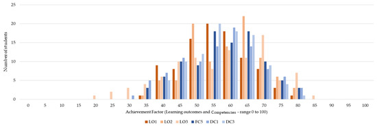 Distribution of achievement factors in the Dynamic Mechanics course (learning outcomes and competencies—range 0 to 100).