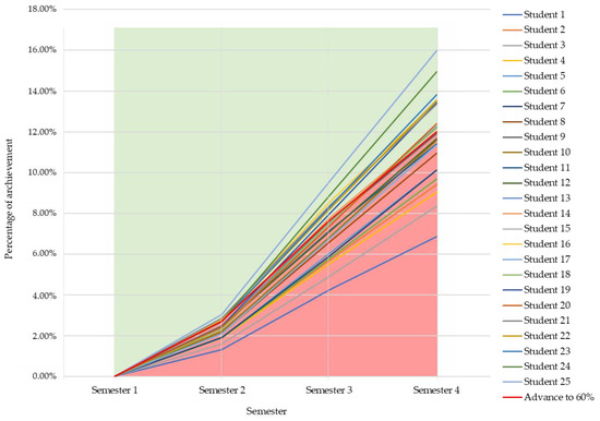 The proposed monitoring of competencies can also be focused on the level of the study program, which allows monitoring of the progress of each competency at different stages in the training process. Understanding that it is a gradual process, we consider, in Figure 7, the development of DC3 competence up to the fourth semester for the 25 students in the sample analysed in this case study. It is possible to visualise the trend of the formation of that competency. The lines in the red zone correspond to those students who, for the indicated semester, have not surpassed 60% of the achievement of the competence that they should have fulfilled in the corresponding courses. If students achieved 100% competency in DC3 in the fourth semester, they would have made 20% progress in this competency regarding the total study program (11 semesters).