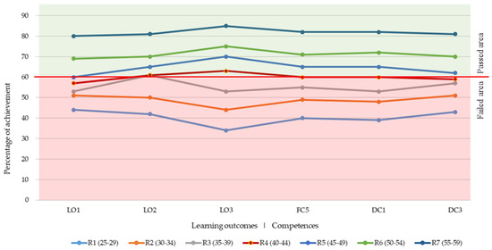 Undertaking a general review of the data and investigation, it is possible to verify one of the premises of this research in terms of average and real scope of learning results and skills. If we look at students numbered 65 and 69 on the list, it is possible to verify that both have an average of 45; therefore, they pass the course, but their individual achievements are not the same. Among the most significant, there are differences of 8, 12, and 6 percentage points between LO1, LO2, and DC3, respectively, for the same final course result.