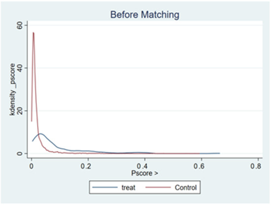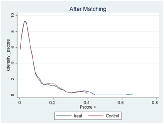 The reliability of the propensity score matching estimates was further measured using the balance hypothesis test. The results are shown in Table 3, from which it can be seen that the absolute values of the standardized deviations of all the matched variables after matching decreased substantially, the standardized deviations of all the matched variables after matching decreased substantially, and the standardized deviations after matching were all within the range of less than 10%, indicating that the matching results were better. Moreover, the T-test results of all matching variables were no longer significant, indicating that there was no significant systematic difference between the treatment and control groups after matching, ensuring the reliability of the subsequent difference-in-difference results. Regarding the matching effect of the treatment and control groups, kernel density function curves before and after propensity score matching were also plotted in this study for comparative analysis. Figure 1 shows that, before the propensity score was matched, the treatment group was unbalanced, the probability density distribution of the propensity score values between both groups is significantly different, and there is selection bias between the samples of the treatment and control groups. Figure 2 shows that, after completing the nearest neighbor matching, the nuclear density curves of the treatment and control groups are very similar. The probability kernel distribution of the two groups tends to be balanced, and the difference between the treatment and control groups decrease significantly, indicating that the main characteristics of the two groups of cities after matching were close, and the selective error of the samples is controlled.