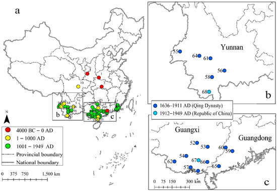 The distribution of Green Peafowl from 5000–6000 (3000–4000 BC) years ago to the establishment of the People’s Republic of China (1949 AD) was illustrated in Figure 1. A total of 68 records were identified (Table S1). The species once lived in around seven of China’s provinces/autonomous regions. The earliest evidence of a Green Peafowl bone was buried in ashy layers in a heritage site in Xichuan county, Henan Province (red spot with No.1 in Figure 1a); it was estimated that the species occurred in this region around 5000–6000 years ago [14,16]. Three records were in central China (Shanxi and Hubei provinces) and southern China (Guangdong province) during the period of 1 to 1046 BC. Twenty-four records were in south and southwest China from 1 to 1000 AD. For the 37 records from the past millennium (1001–1949 AD), all were in south and southwest China (Figure 1a). Since the Qing dynasty (1636–1911 AD), the China’s Green Peafowl population has been confined to Yunnan, Guangxi, and Guangdong (Figure 1b,c). In addition, three records were identified as Indian Peafowl (Table S1 and Figure S2).