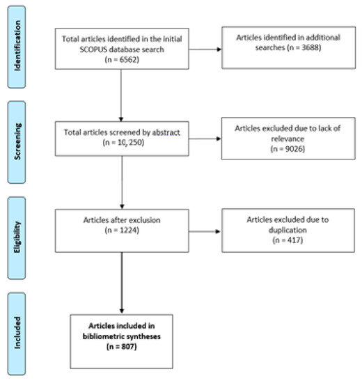 The Scopus search followed PRISMA (Preferred Reporting Items for Systematic Reviews and Meta-Analyses) guidelines for conducting systematic reviews of research [42]. Screening of documents was conducted by two of the authors, who jointly developed the conceptual background for this study and jointly reviewed document titles and abstracts for eligibility. The most common reason for excluding documents was lack of topical relevance. A large number of documents included the abbreviation ‘HR’ which, however, stood for something other than ‘human resources’. The second most common reason for excluding documents was lack of a substantive focus on HRM. In a number of documents, HRM was mentioned as one of several corporate functions, but the article lacked a focus specifically on HRM. A third reason was that documents used the word “sustainable” in a general way, but sustainability was not a central focus of the study. Finally, during this iterative search process, some newly selected documents were duplicates that had already been identified in earlier searches. The 1224 eligible documents were merged into a single list comprised of 807 S-HRM Scopus-indexed documents (see Figure 1).