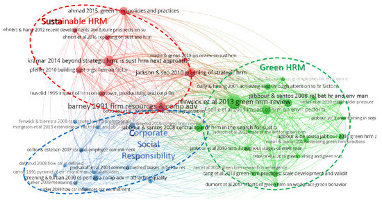 Next, we classified the 20 most frequently cited references contained in the review database according to the thematic domains identified in Figure 3 below (as grouped by VOSviewer software). Twelve of the documents were associated with ‘Green HRM’, six documents were classified under ‘sustainable HRM’, and two under ‘corporate social responsibility’.