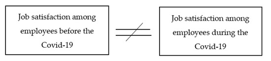 Garg et al. [32] found a positive effect between work engagement and job satisfaction among employees. Results show that job satisfaction leads to higher work engagement [32]. During COVID-19, employees face lower satisfaction, which leads to a lower level of work engagement [7]. For most of them, a change of environment was the biggest challenge, going from the office—where everyone is among colleagues in work-mode, to home—where varying contrasts abound (such as being alone, having young children at hand or elderly relatives to care for, or even a neighbouring baby or pet making noise), all of which would be disruptive to any workflow [2,5]. A high level of occupational stress leads to lower job satisfaction and lower work engagement [19]. On the other hand, employees who can balance their work and home responsibilities during COVID-19 reported lower stress and a higher level of job satisfaction, which, in turn, also leads to more outstanding work engagement [32]. Additionally, employees who are well engaged in an organisation will lead to productivity in their place of work, and this generates higher customer satisfaction and, ultimately, developments in sales and profit for the organisation [14]. Work engagement is a crucial element of employee and organisation success. It predicts employee performance, organisational success, and the financial performance of the organisation. The impact of employee engagement or disengagement manifests in the productivity of the organisation [33]. During the pandemic, employees face high occupational stress [24], which leads to low job satisfaction [26] and also a low level of work engagement during COVID-19 [14]. According to Kamal et al. [31] and Toscano and Zappalà [7], during COVID-19, employees have been less satisfied, leading to lower engagement and therefore lower productivity. On that basis, we want to examine if there are any differences in the strength of the effects among constructs in the conceptual model between employees in two intersectional times before and during the COVID-19 pandemic. Therefore, we developed a conceptual model and the following hypothesis with four sub-hypotheses (Figure 5):