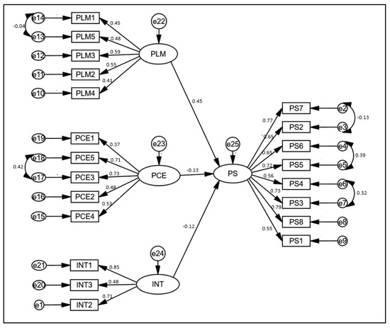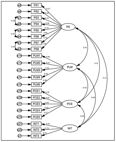 The reliability of all structural measurements is estimated using Cronbach’s alpha reliability, which explores the internal consistency and the properties of the measuring scale. Table 3 provides a summary of Cronbach’s alpha for each of the constructs measured. According to George and Millery (2003) [65], alpha frequencies indicate a more reliable level at 0.7 while a value greater than 0.8 indicates a higher level of reliability. As the table shows, the alpha coefficients for PS and INT are above 0.7, thus indicating adequate internal consistency for those variables. Meanwhile, PLM and PCE are 0.61 and 0.68, respectively, which can be considered acceptable. In general, it can be concluded that all the latent constructs were characterized by good internal consistency allowing further analyses.