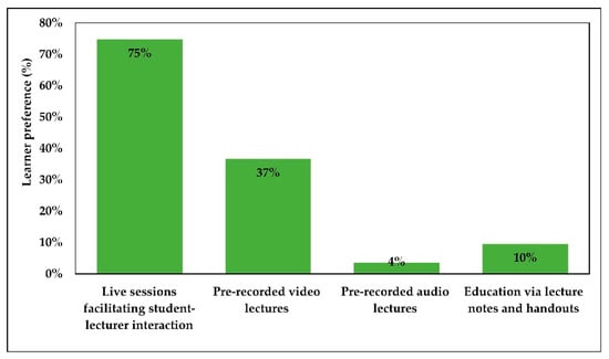 As Figure 5 shows, out of the four modes of receiving learning input, 75% of the students prefer live sessions facilitating student-lecturer interaction over pre-recorded video lectures, pre-recorded audio lectures and education via lecture notes and handouts. This emphasizes that the interaction between the lecturer and the student is a decisive factor in online learning too. Therefore, it is not surprising that it is a major determinant of student satisfaction in online learning [45,46]. This could also imply the learner’s long habituated dependency on the lecturer, a cognitive engagement that he/she cannot overcome in adapting to a new learning environment. Hence, more effort is needed to enhance student-student and lecturer-student interaction in online teaching. The active use of social media applications, chat rooms, breakout rooms during online sessions can facilitate this interaction, which would ultimately result in more student satisfaction with online learning. Taking learner needs into consideration in designing teaching activities may also alleviate any anxiety that they may have with the new learning experience: “For those who have never taken an online course or who have little computer experience, an online course may be frightening [77]”. This can also be supported by any training that can be provided to students by the institution concerned to enhance their online learning skills. This can help them not only to explore the possibilities available to them in the online mode but also overcome at least some of the challenges they encounter in their online learning, in particular some technical challenges that may hinder their progress.