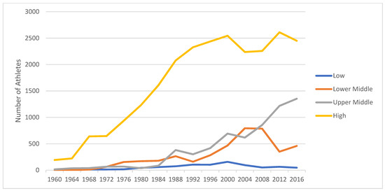 Number of Paralympians per year from 1960 to 2016 by income level.