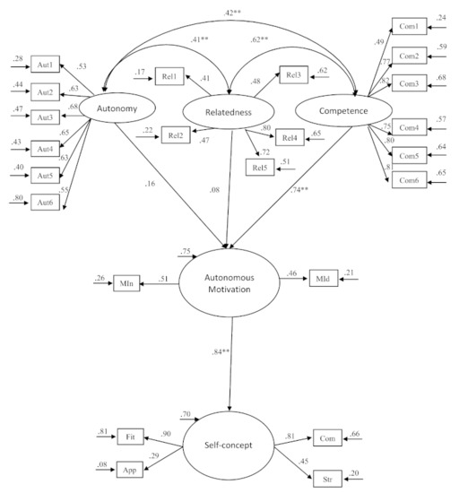 Structural equation model (SEM) which analyses the relationships between autonomy, relatedness, competence, autonomous motivation and self-concept. Note: ** p < 0.001.
