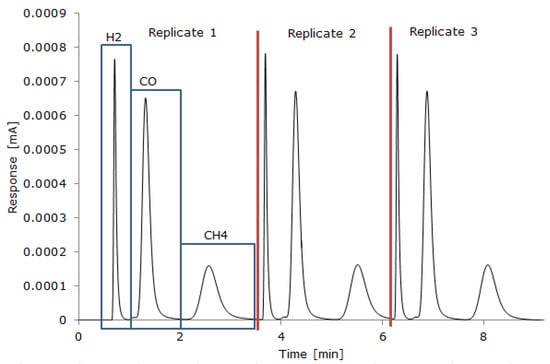 A typical chromatogram of the analysis of H2, CO, and CH4 by GC-TCD.