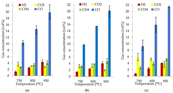 The H2, CO, CH4, and CO2 concentrations in the producer gas obtained at 750, 850, and 950 °C with an average RSD of 11.8% are shown in Figure 3a–c. H2, CO, CH4, and CO2 were the main gas species obtained from gasification; the rest of the producer was gas composed of H2O; O2; sulfur dioxide (SO2); hydrocarbons such as ethane (C2H6), ethylene (C2H4), propane (C3H8), hexane (C6H14), benzene (C6H6), and toluene (C7H8); and nitrogen-containing compounds NO, NO2, N2O, NH3, and other hydrocarbons.