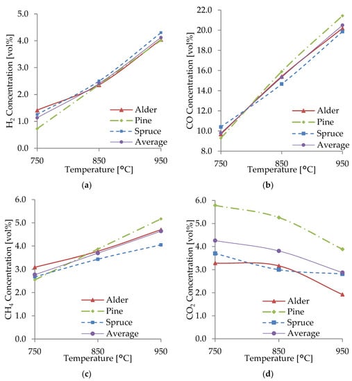 Figure 5a–d display the effect of the gasification temperature on the main combustible gases (H2, CO, and CH4) and CO2 from spruce, alder, and pine gasification. It is observed that as the gasification temperature increased from 750 to 850 and 950 °C, the H2, CO, and CH4 concentrations increased, while the CO2 concentration decreased as the temperature increased. The levels of H2, CO, and CH4 at 950 °C were higher than those in gasification at 750 °C by 3.6-, 2.1-, and 1.7-fold, respectively. The behavior is consistent with what Almeida et al. [39] found during the gasification experiments at 700–950 °C using olive kernels, waste, and bagasse as feedstock, where a significant increase in H2, CO, and CH4 concentrations was observed up to 850 °C, while CO2 levels decreased. Similarly, the present results agree with the findings of Halim et al. [40] of palm fiber gasification at 650–900 °C, where it was found that with increasing temperature, H2 concentrations and CO concentrations increased, but CH4 concentrations decreased. The results of Yahaya et al. [41] also agree with the current results, which indicate that increasing the temperature from 700 to 900 °C increased CO and H2. Likewise, a study on the gasification of empty fruit bunches by Lau Sze Yii et al. [42] showed an overall higher volume percentage of H2, CO, and CO2 at 900 °C compared to those at 700 and 800 °C. The effect of temperature was similar also for household waste studied by Zeng et al. [43], where H2, CO, and CH4 gradually increased, while CO2 decreased as the gasification temperature increased.