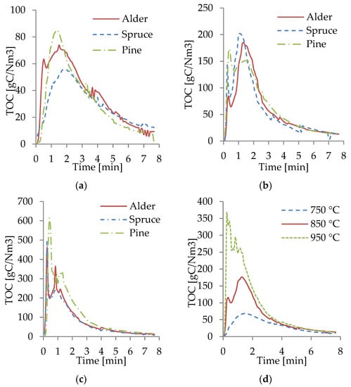 For all the temperatures and all WB species, the largest TOC peaks occurred at the beginning of the gasification. Moreover, it was observed that the gasification ended after 7–8 min, when the TOC production was stable and close to zero and most of the biomass had been transformed into gas, tar, and solid residues. The TOC content was observed to be similar for all WB samples, as shown in Figure 8a–c. This behavior was expected based on the results of the composition of the biomass and the results obtained from the composition of the producer gas. The slight differences in the TOC content of pine correlated with the slightly higher concentration of CH4, CO, and CO2 in the producer gas. Figure 8d shows an average of the TOC content at different temperatures, where it can be visually seen how significantly higher the TOCs production was at 950 °C, compared to 750 °C, which can be related to the higher concentration of CO and CH4 in the producer gas as the gasification temperature increased.