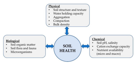 Biological, physical, and chemical components of soil health. (Source: modified from Moebius-Clune [22] and Hills et al. [23].).